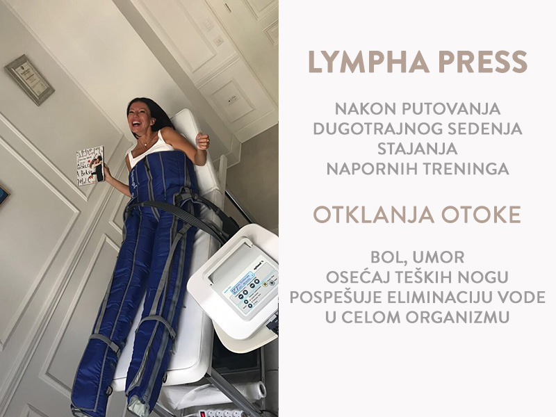 Aparat za limfnu drenažu Lympha press ima specijalni program Pre Therapy koji pre svake procedure limfne čvorove prazni (u predelu prepona- pantalone). Time sprečava nastanak posledica i čini limfnu drenažu efikasnom i sigurnom.